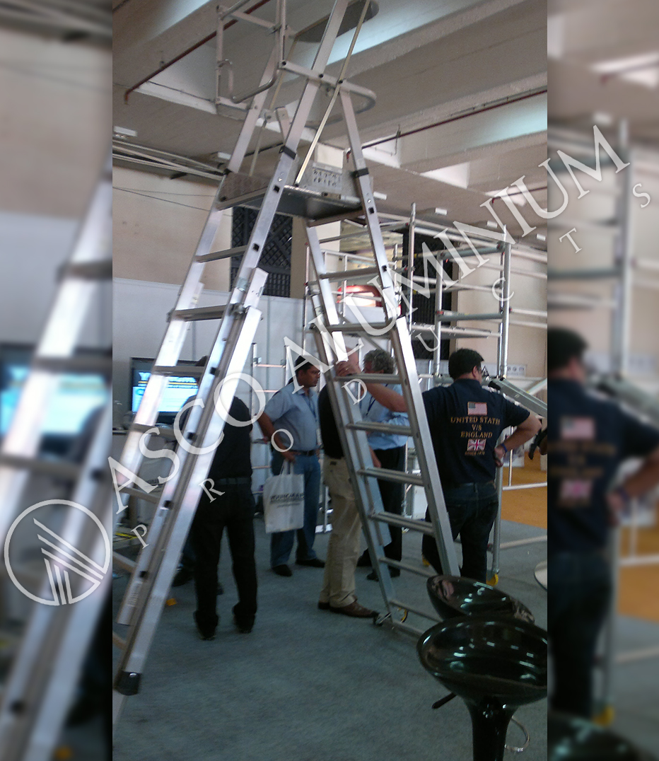 This work platform offers the maximum in stability and safety, using double guardrails, steel toe boards and a positive locking gate to ensure safety while on the platform and rubber feet to prevent movement.